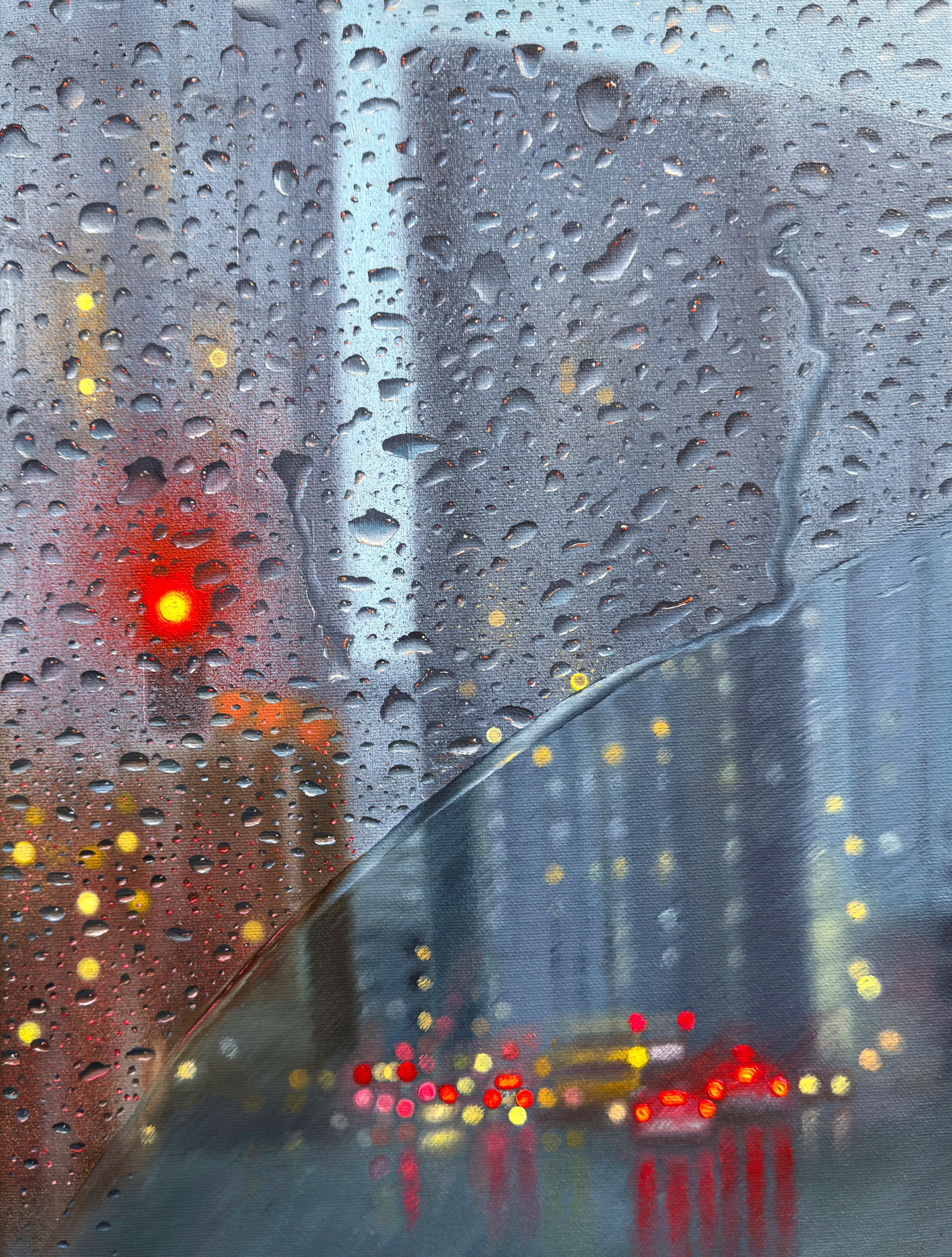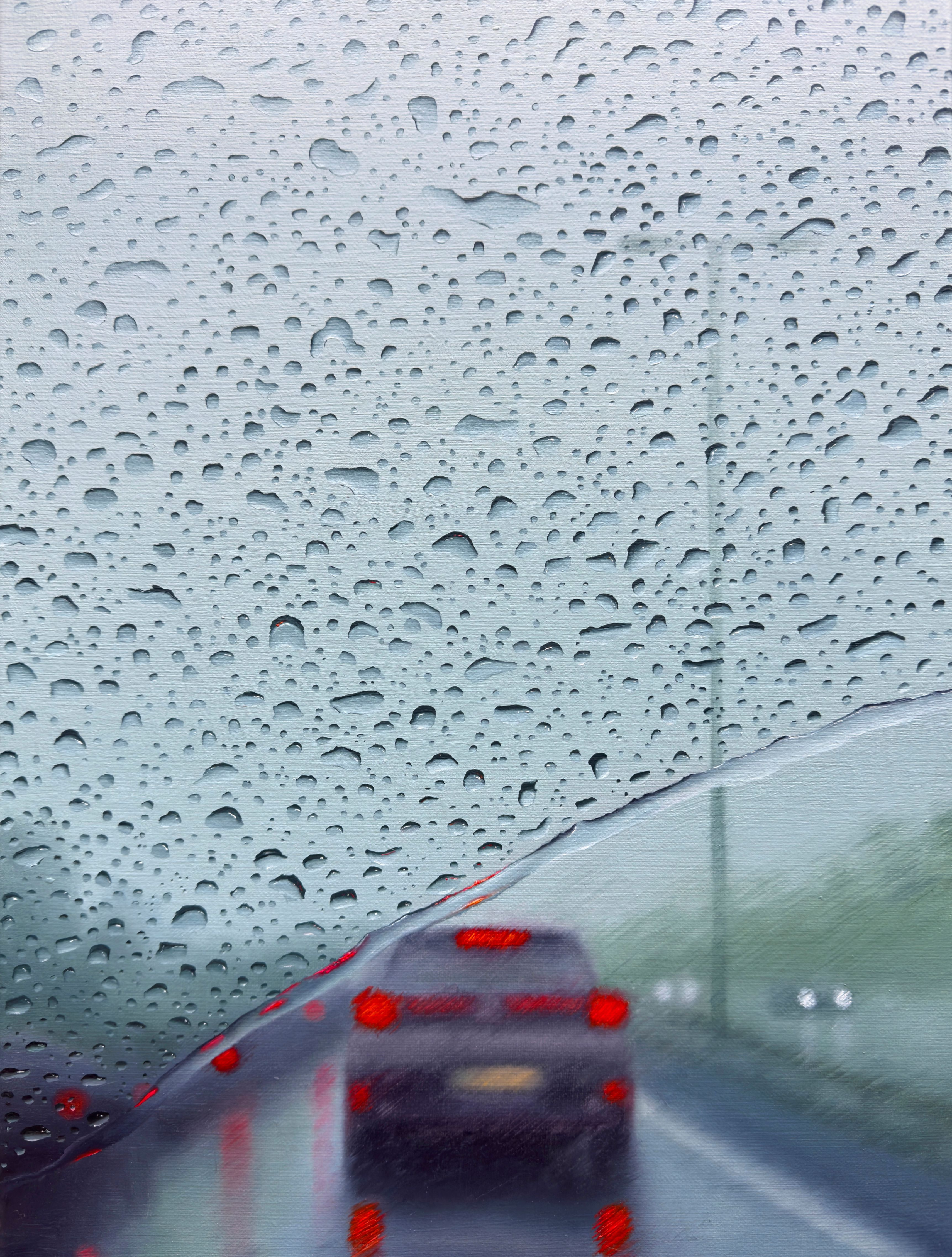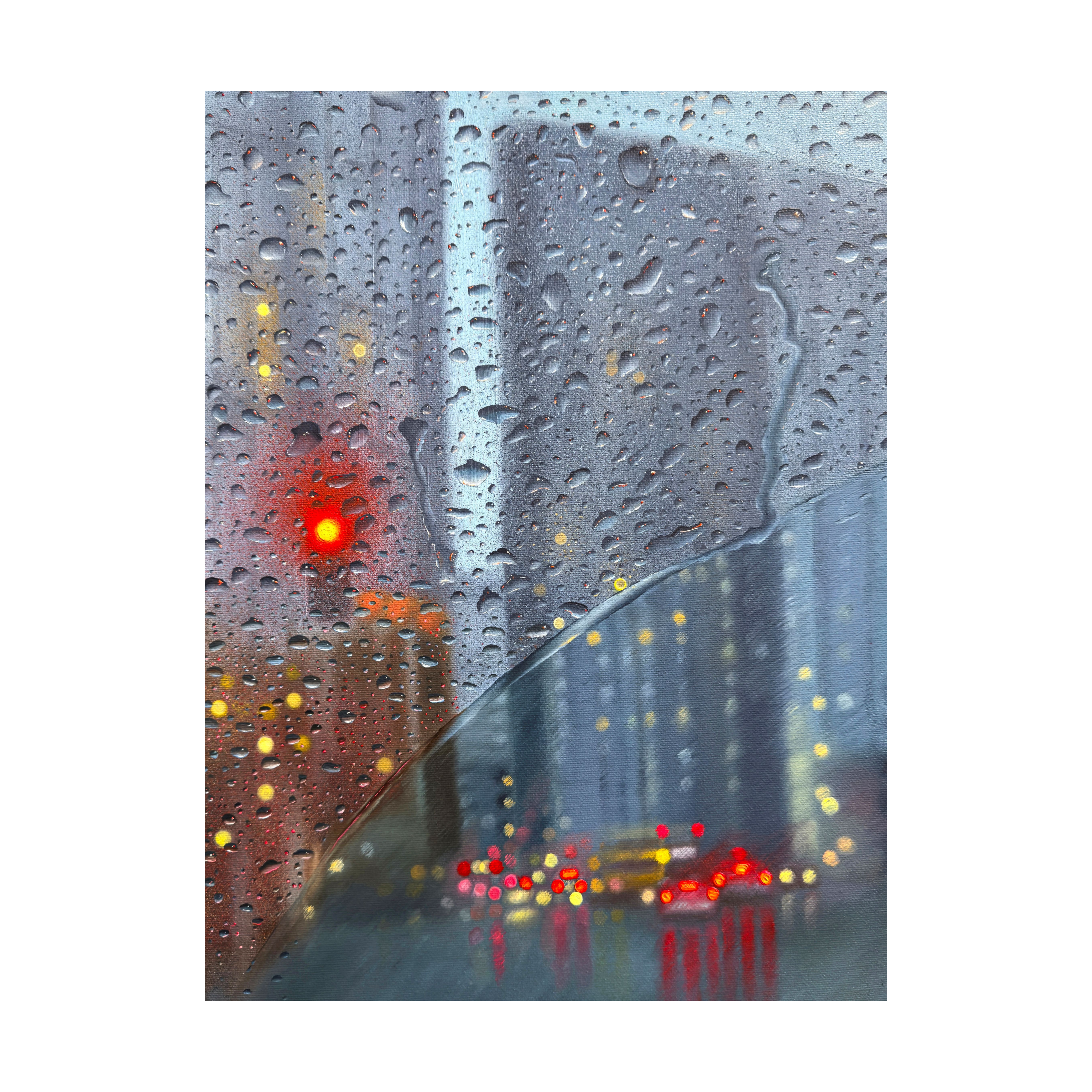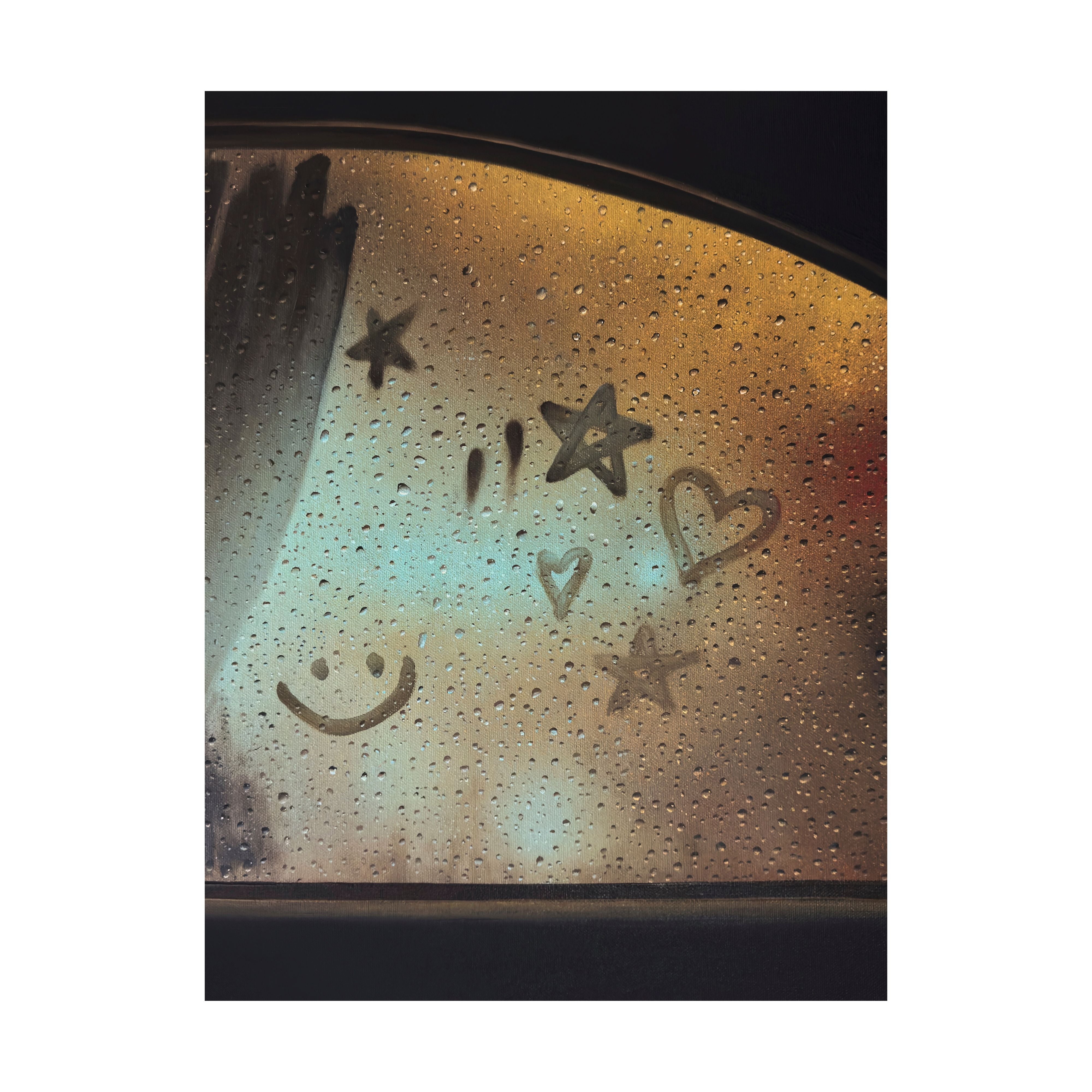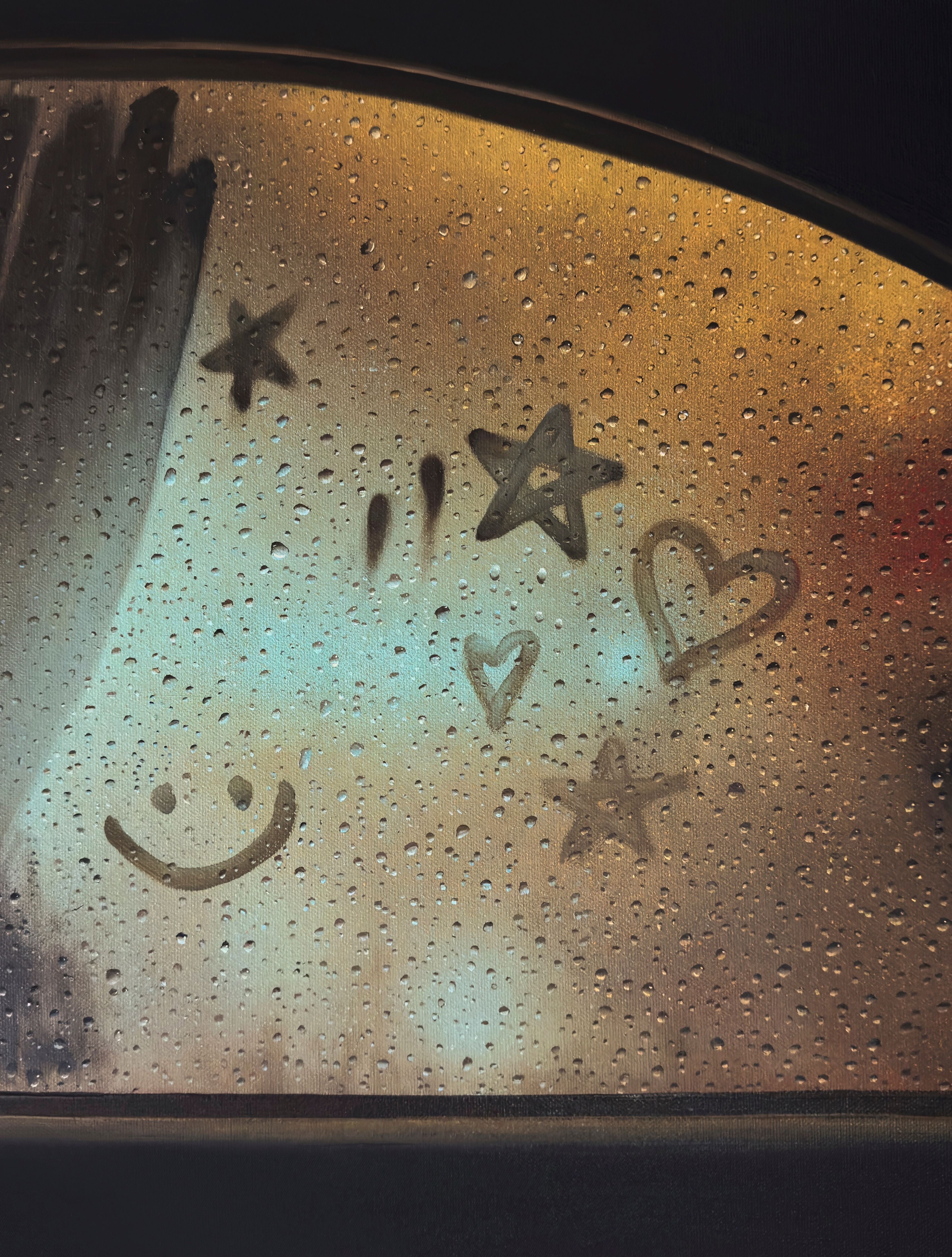 Between Worlds began with a wish to hold the past and the present side by side. In the early pieces, I return to that childhood feeling of sitting in a car on a rainy evening, watching warm yellows and soft blues blur across the window while little doodles formed a secret language we all understood. As the series moves forward, the palette shifts into cooler blues and clearer lights and the viewpoint becomes quieter and more observant. The doodles fade and the focus turns to the stillness that comes with adulthood, where the rain becomes something to notice rather than something to play with.