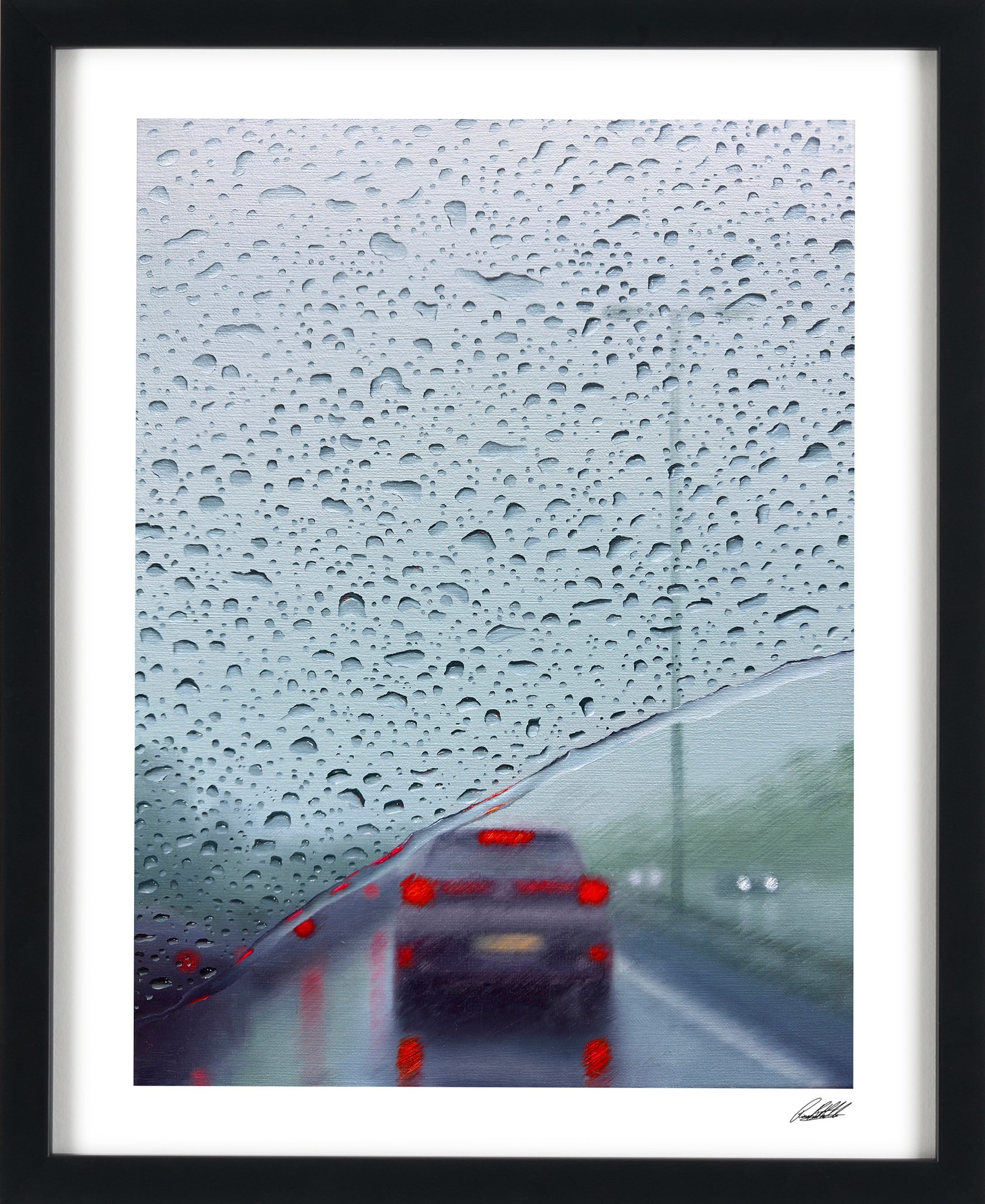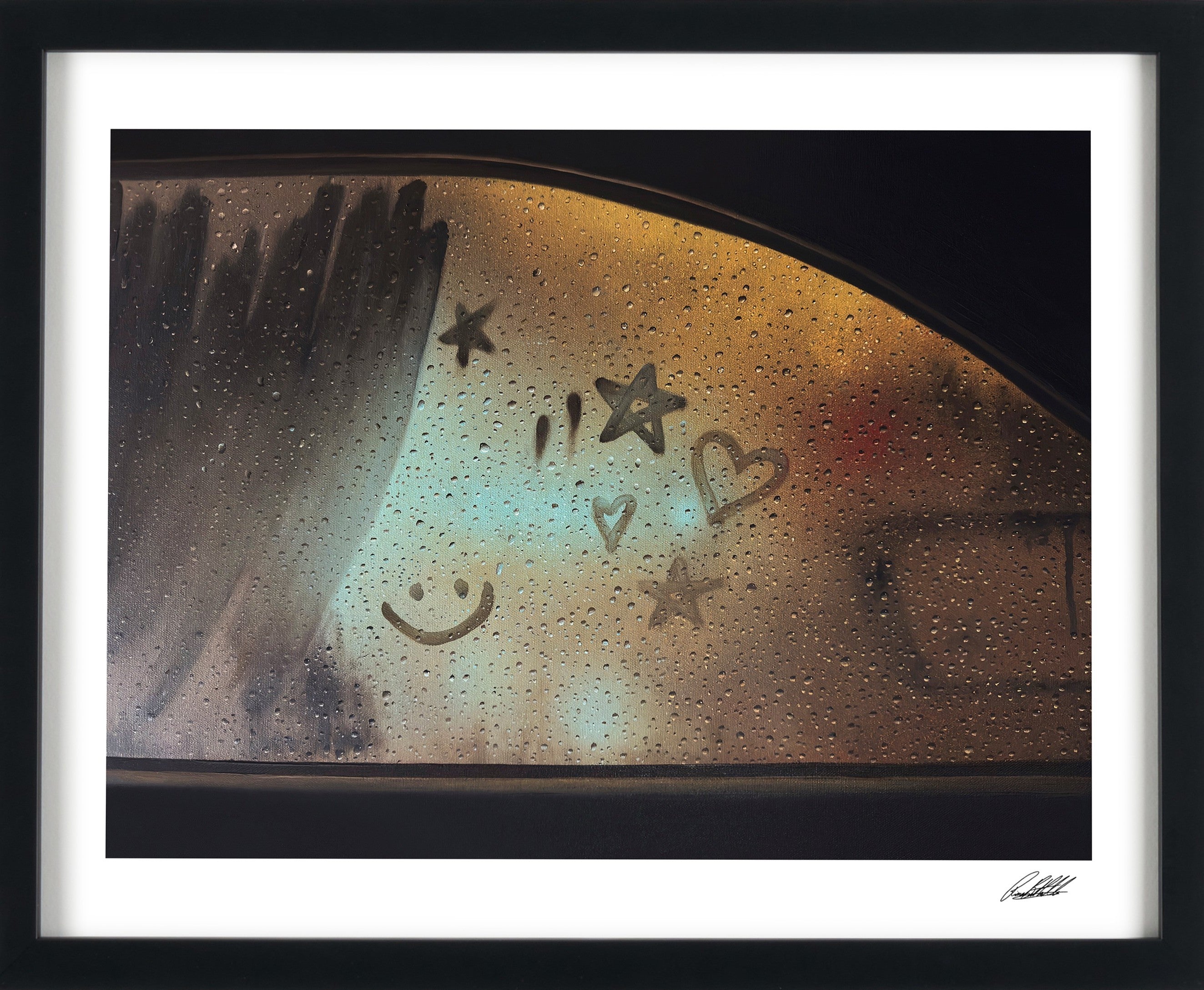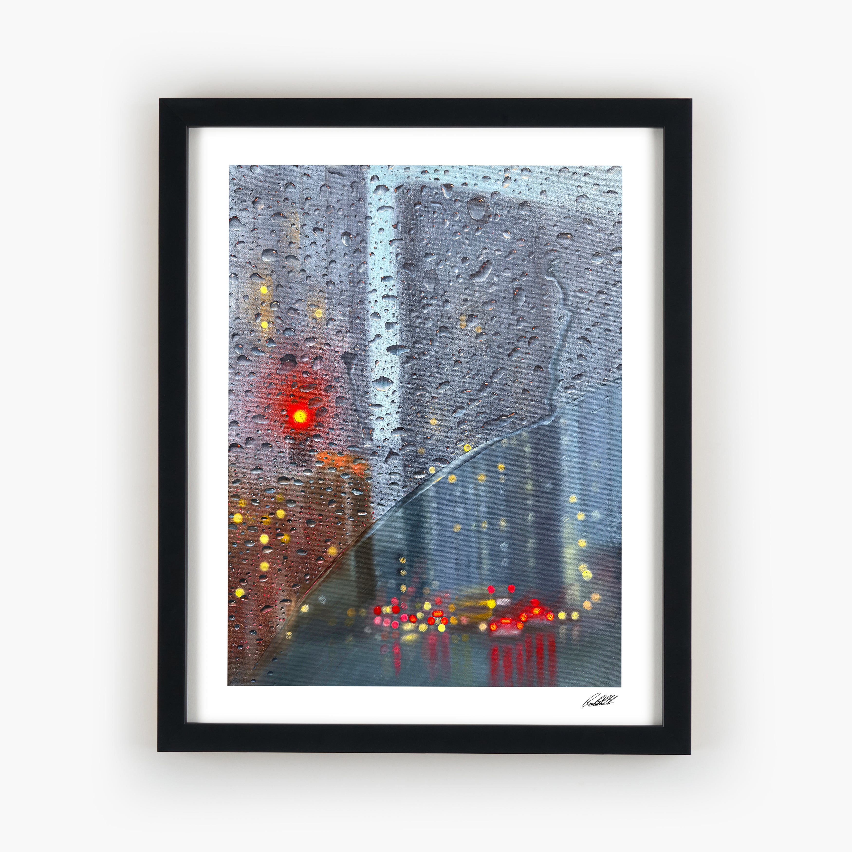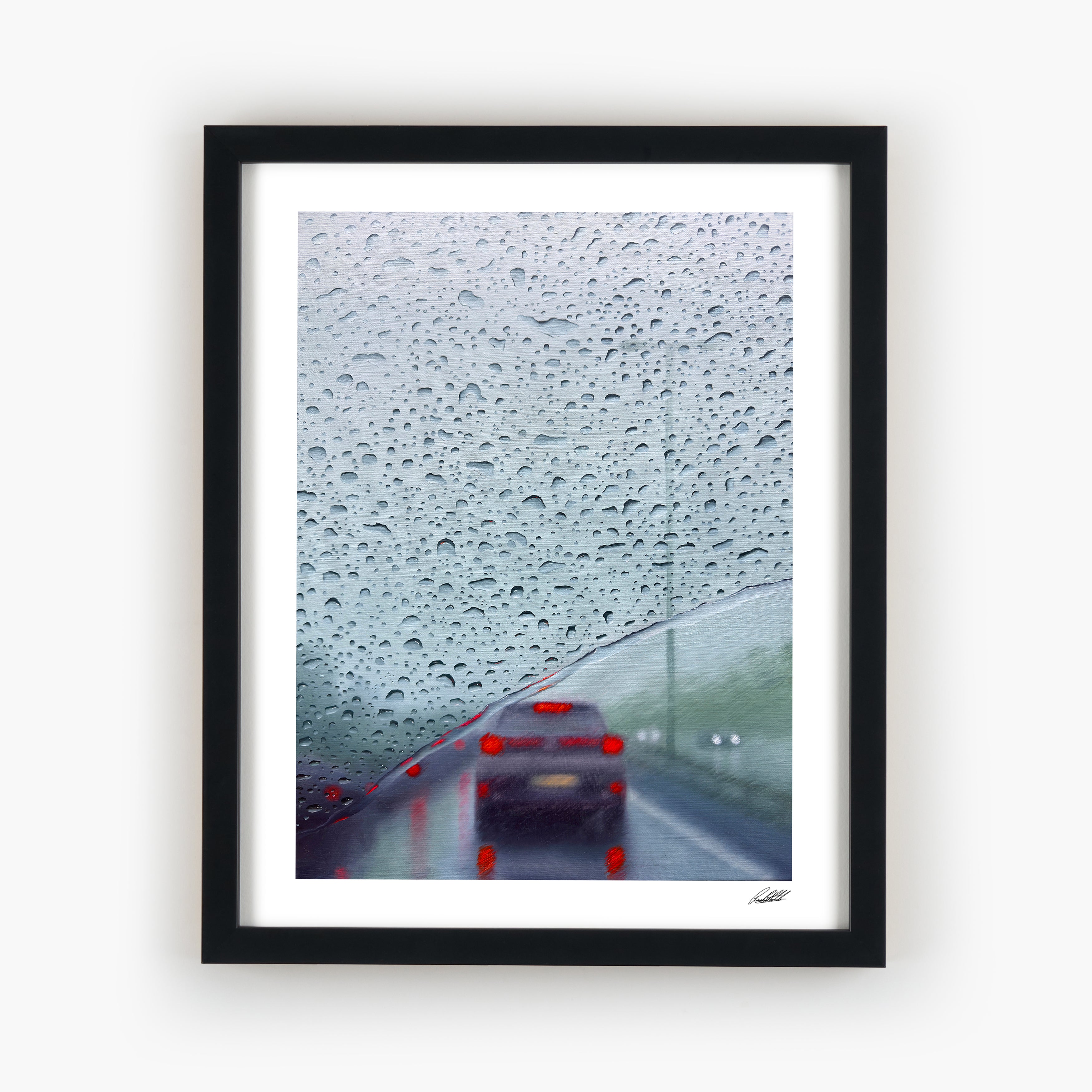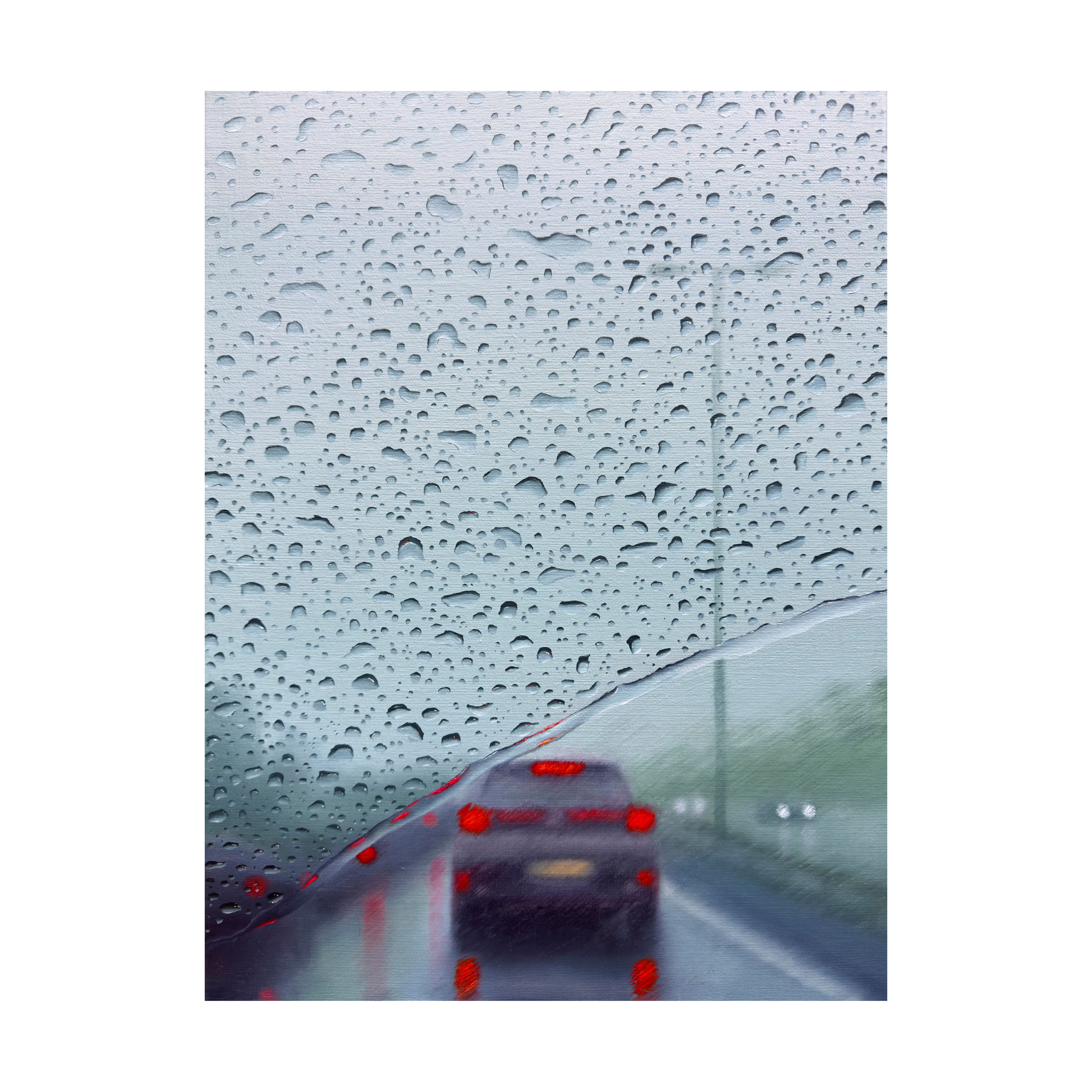 Between Worlds began with a wish to hold the past and the present side by side. In the early pieces, I return to that childhood feeling of sitting in a car on a rainy evening, watching warm yellows and soft blues blur across the window while little doodles formed a secret language we all understood. As the series moves forward, the palette shifts into cooler blues and clearer lights and the viewpoint becomes quieter and more observant. The doodles fade and the focus turns to the stillness that comes with adulthood, where the rain becomes something to notice rather than something to play with.