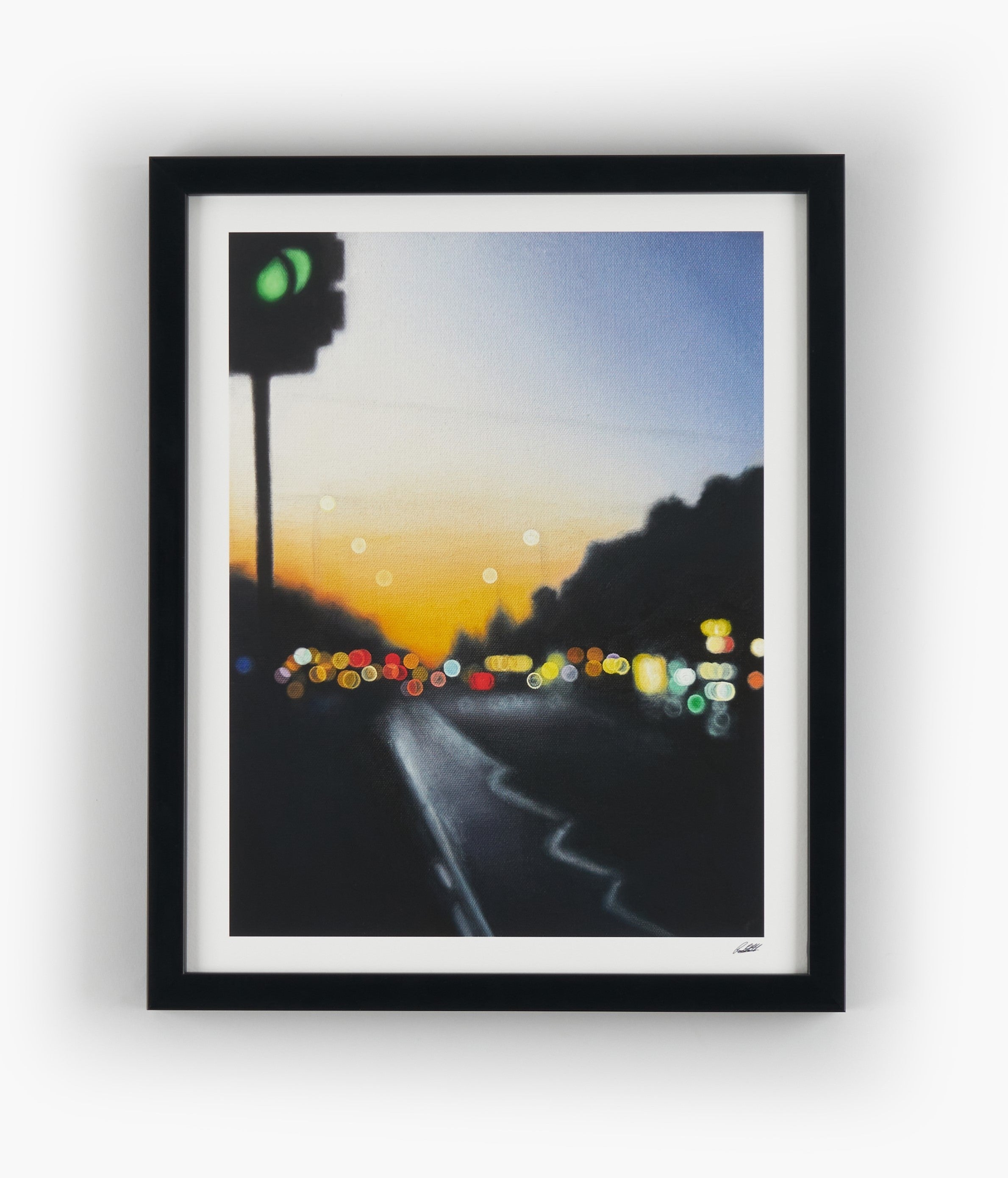 When Day Turns to Night’ captures the enchanting transition from day to night with a vibrant sunset in the background, blending seamlessly into the soft hues of twilight. The painting's bokeh effect, featuring blurry, colorful lights, evokes the dreamy essence of summer nights, where the fading warmth of the sun meets the tranquil glow of evening. The colors create a nostalgic atmosphere, making one reminisce about peaceful summer nights.