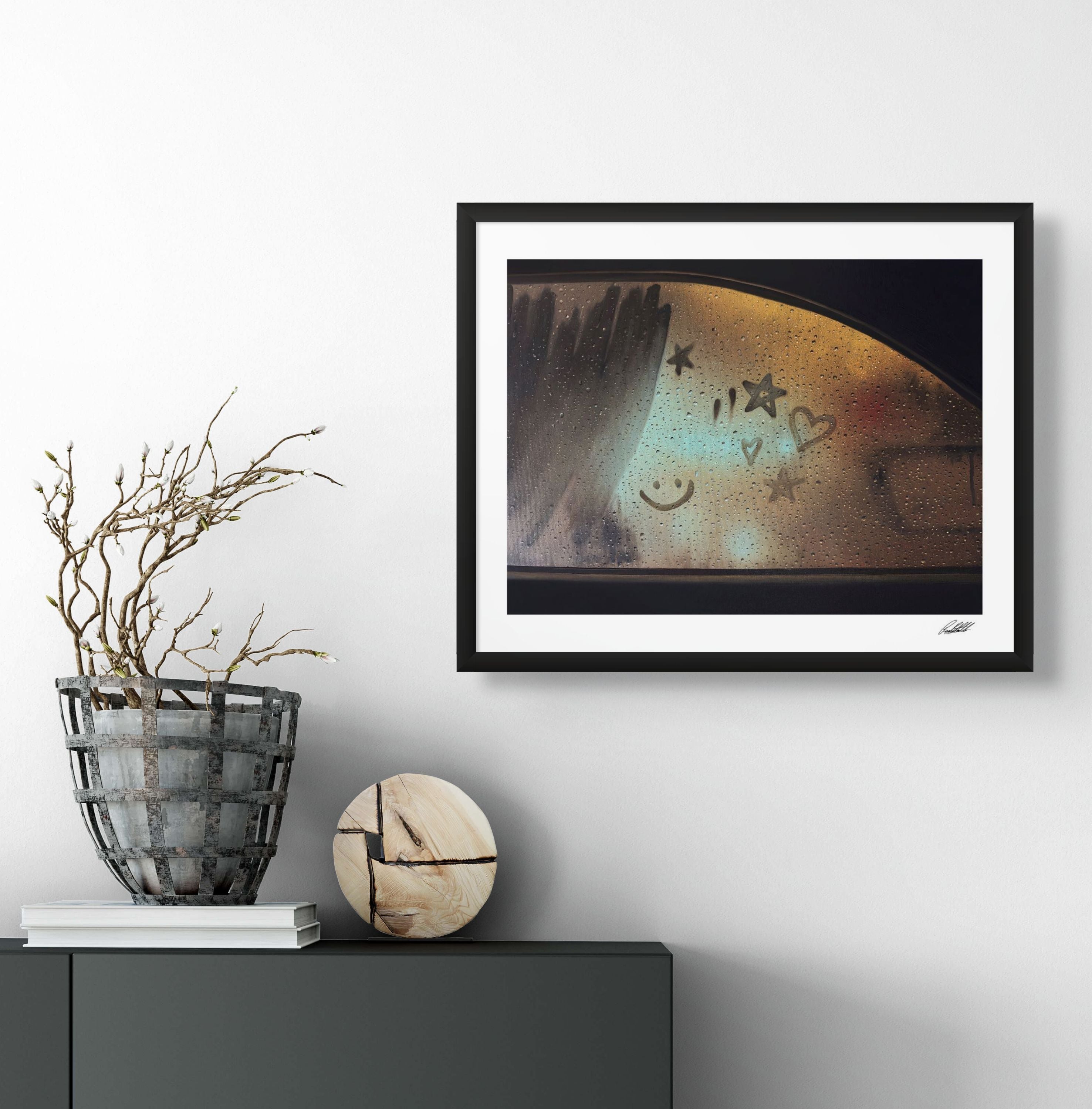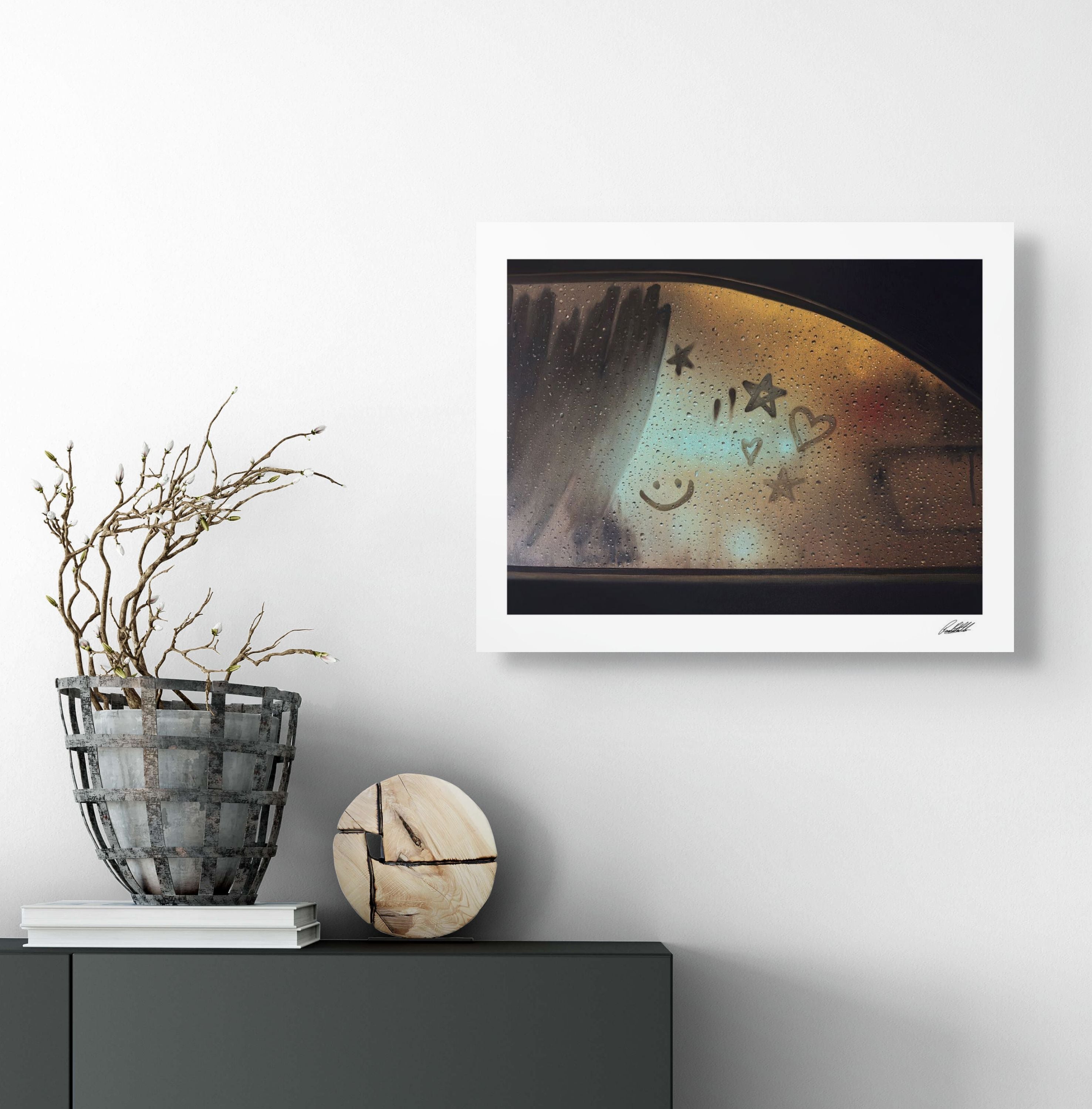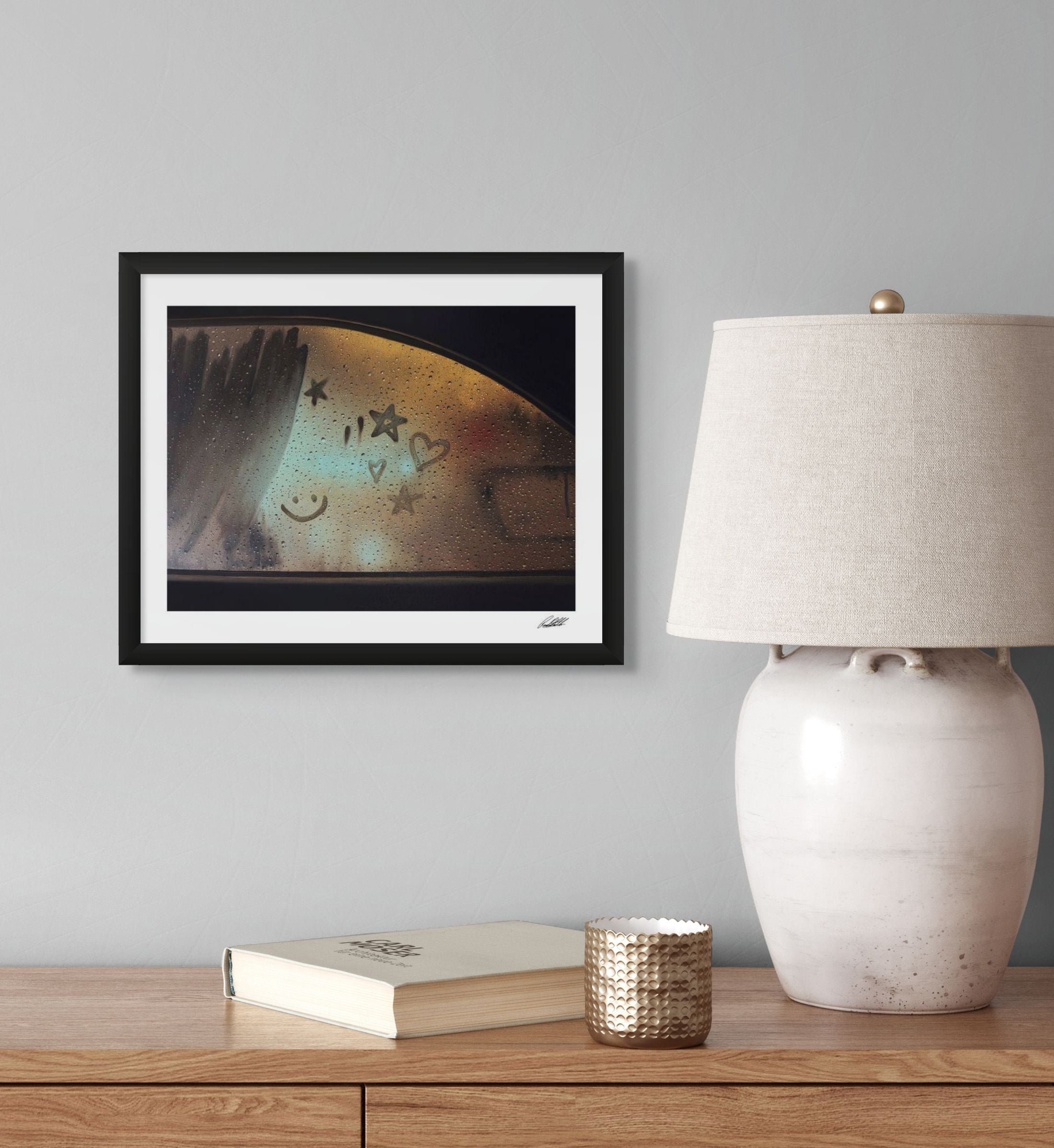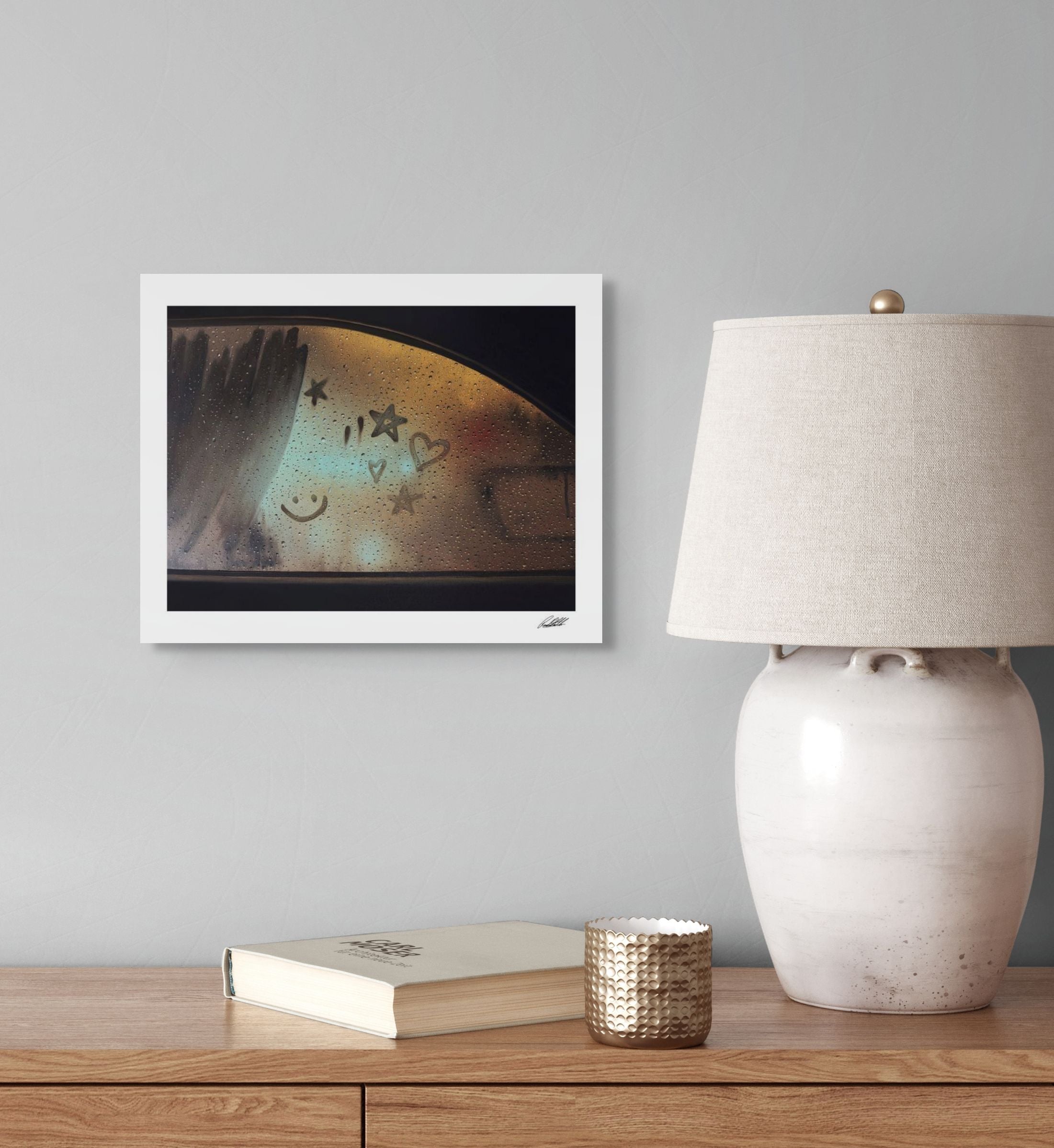 This piece takes me back to the kind of evenings where everything felt slow and the rain on the window made the whole world look softer. I leaned into warm golds and gentle blues to bring out that familiar glow of childhood and the way lights used to blur into something comforting. The little stars, hearts and smiley faces are the marks we all used to make, a small shared language that showed up whenever the windows fogged. Painting this reminded me of how simple those moments were and how they still shape the way I see rain now. I hope anyone who spends time with it feels a bit of that same memory return.