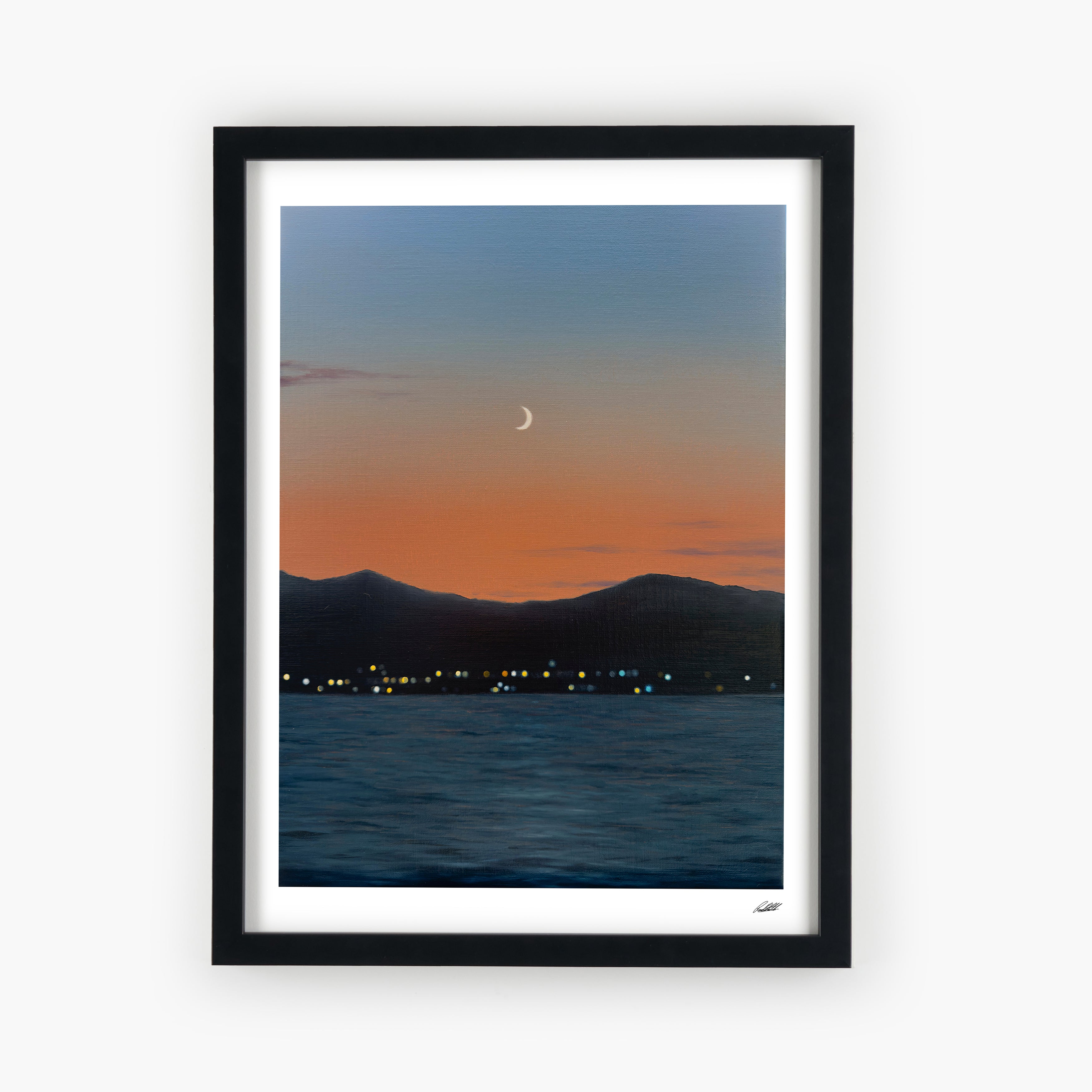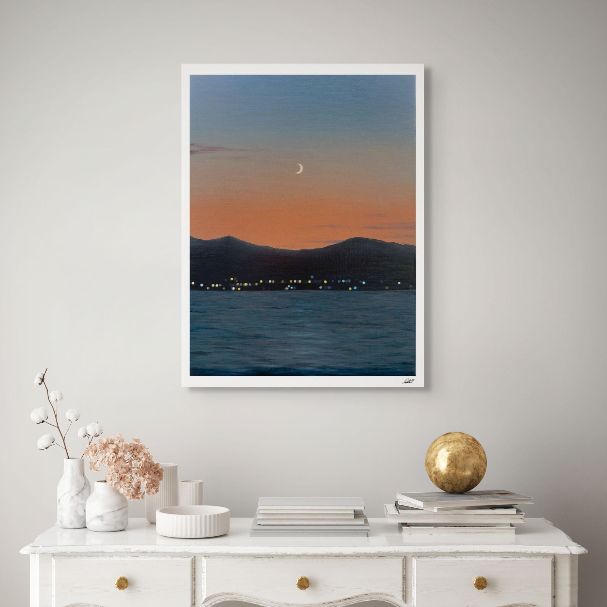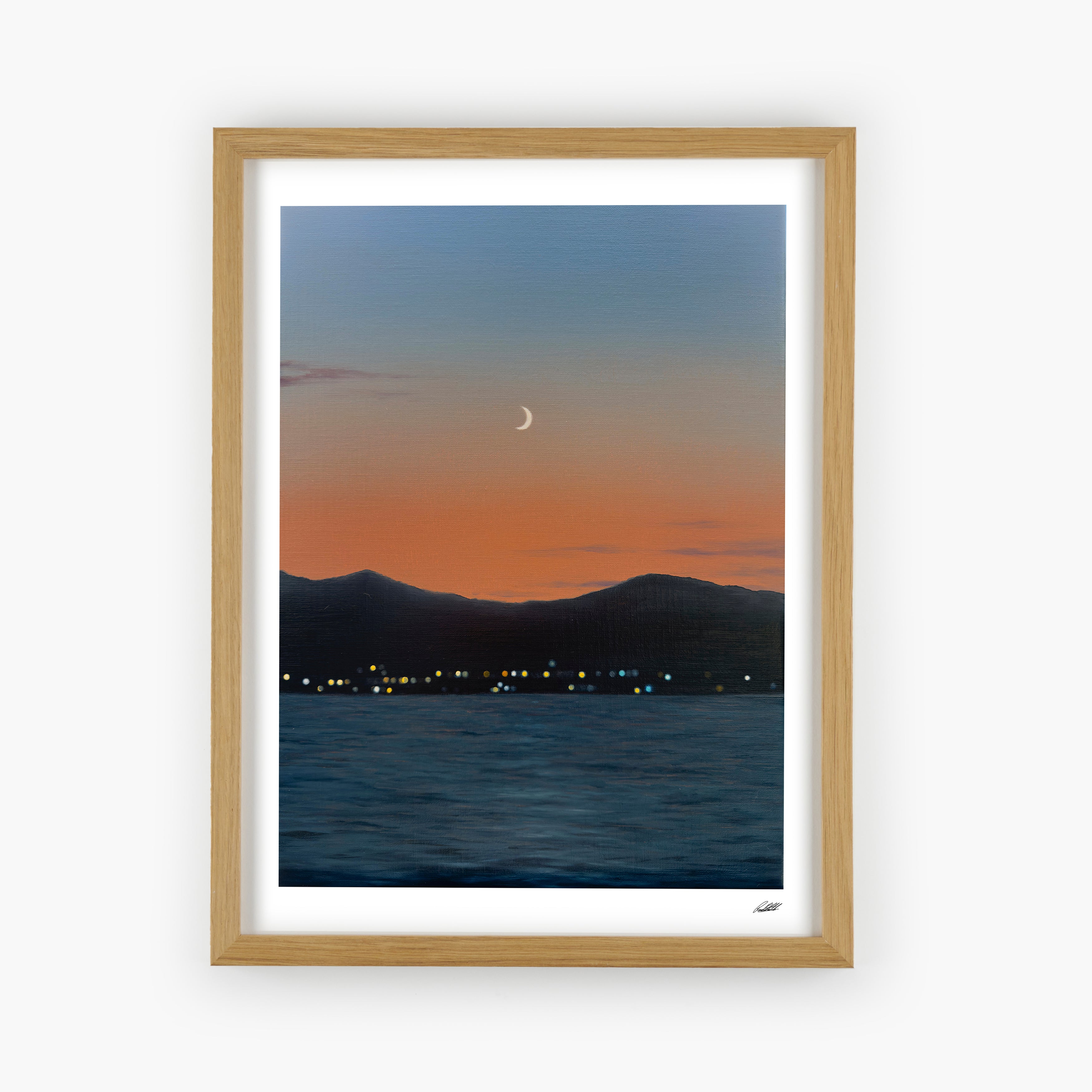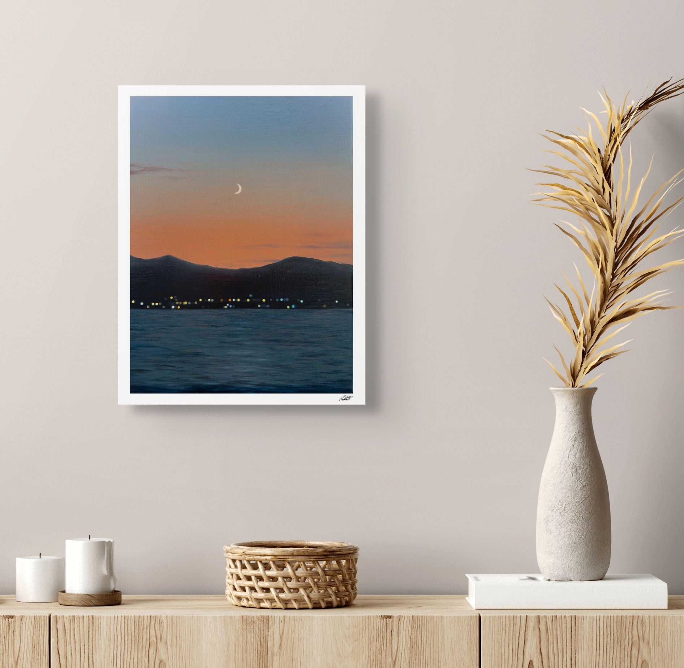 I painted Crescent after one of my last nights in Croatia. The sky was turning coral and violet, and a small crescent moon hung above the water. It felt peaceful, almost cinematic, the kind of scene that stays with you long after it’s gone. The colours are soft but still carry the glow of that evening.