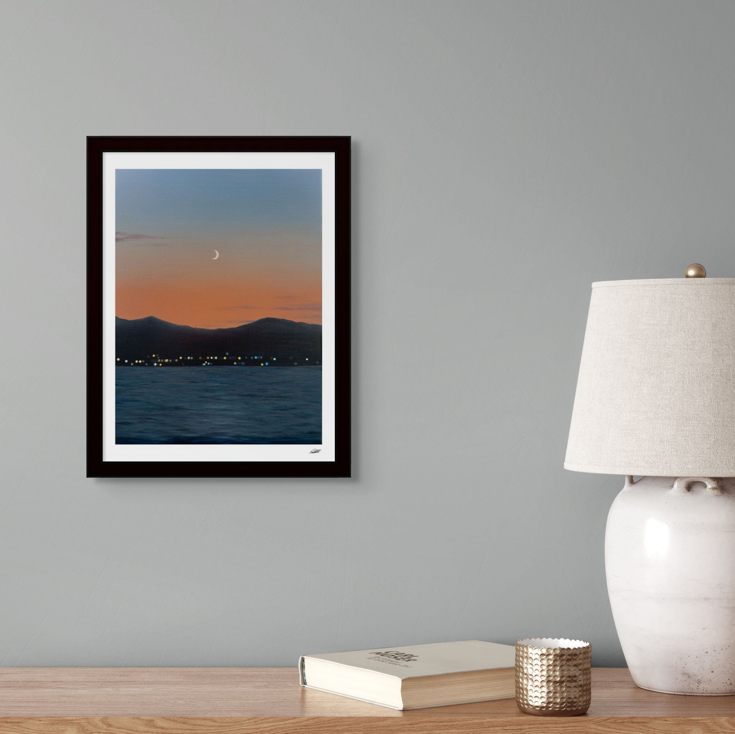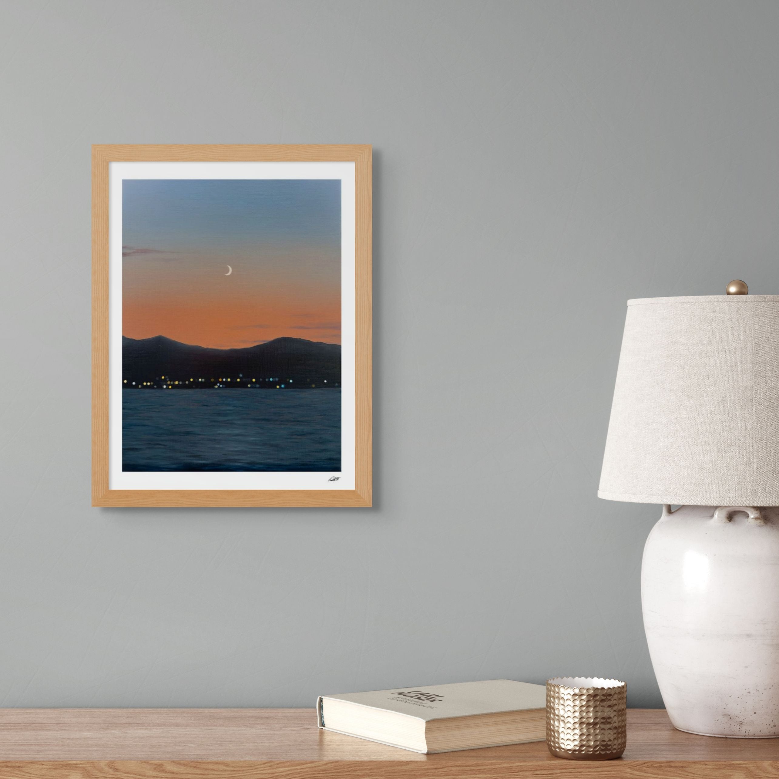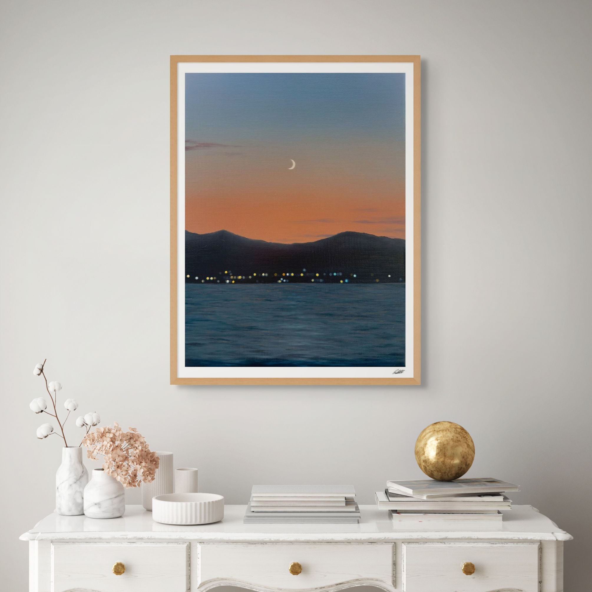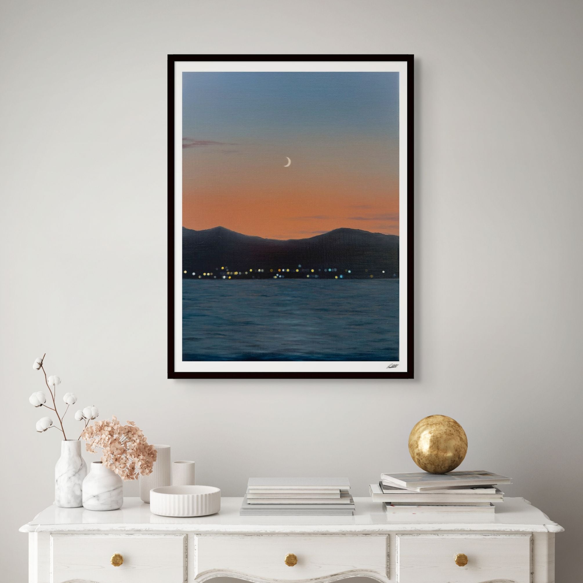I painted Crescent after one of my last nights in Croatia. The sky was turning coral and violet, and a small crescent moon hung above the water. It felt peaceful, almost cinematic, the kind of scene that stays with you long after it’s gone. The colours are soft but still carry the glow of that evening.